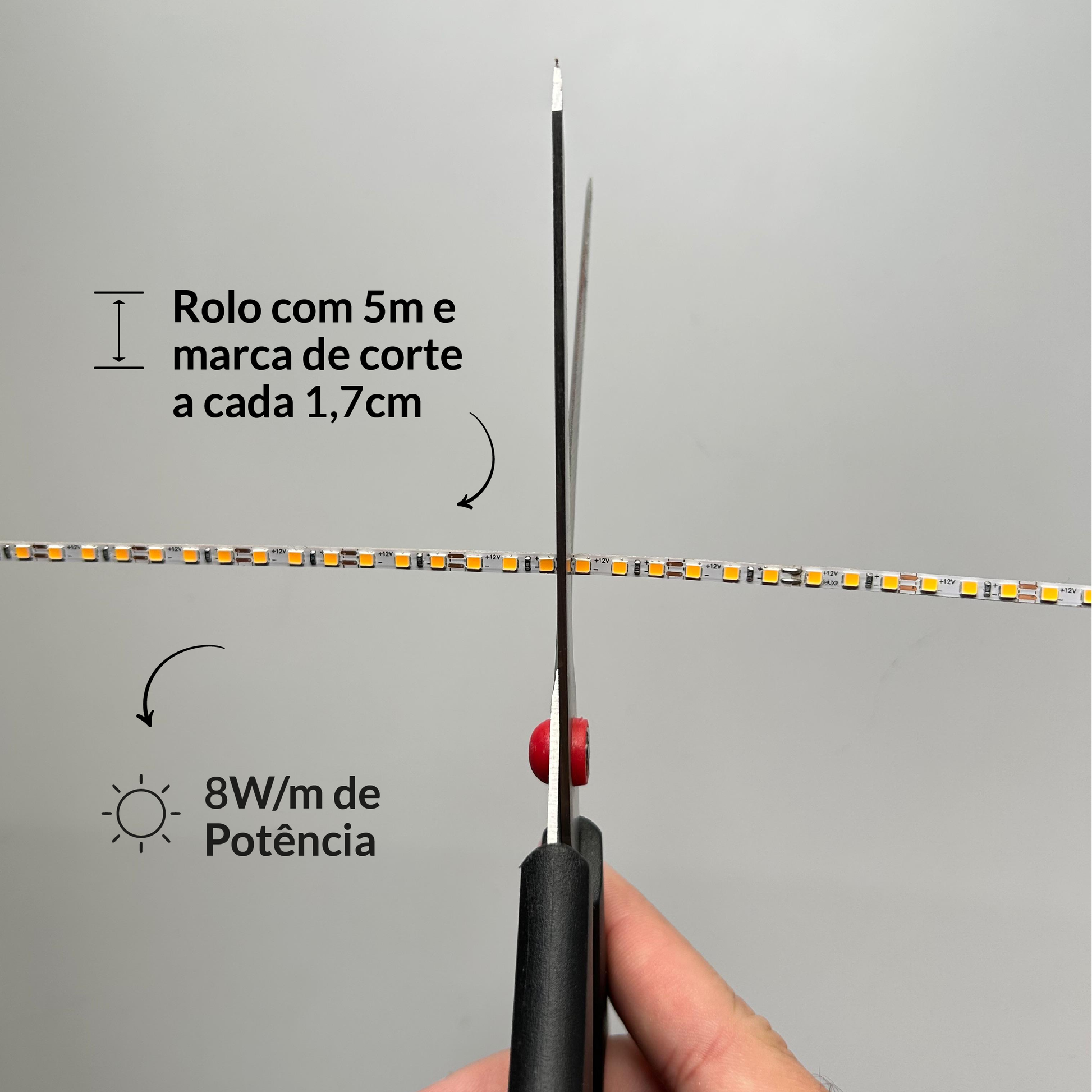 - Flexibilidade: A fita é vendida em rolos de 5 metros com linhas de corte a cada 1,7cm, permitindo a personalização do tamanho para se adaptar a qualquer projeto.