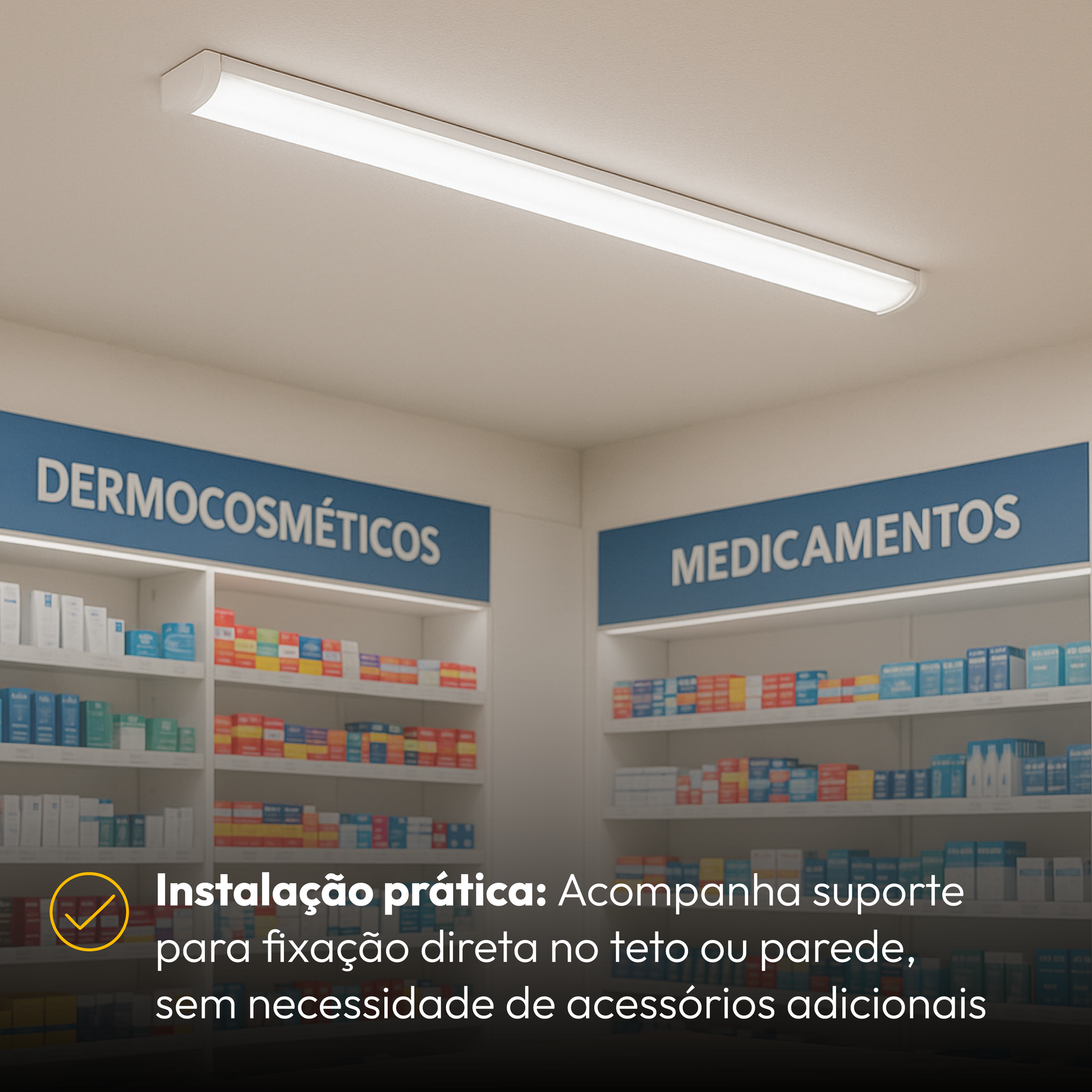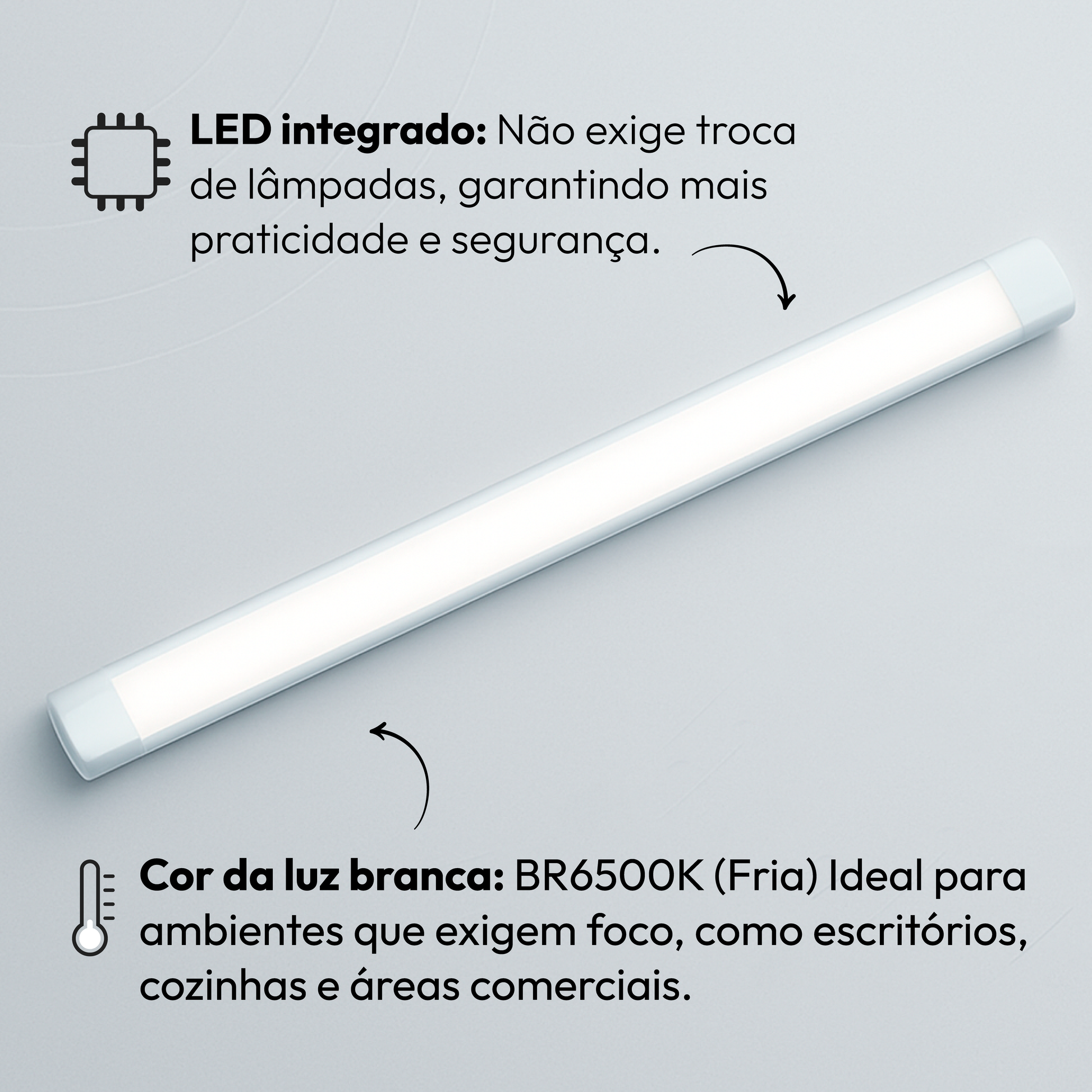 Com luz branca de 6500K, a Luminária de Teto Linear 20W é excelente para cozinhas, lavanderias e ambientes corporativos, proporcionando foco e clareza. Além disso, a Luminária de Teto Linear 20W foi projetada para uma distribuição de luz em 120°, eliminando sombras indesejadas.