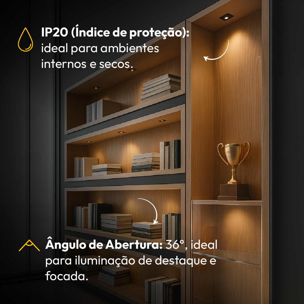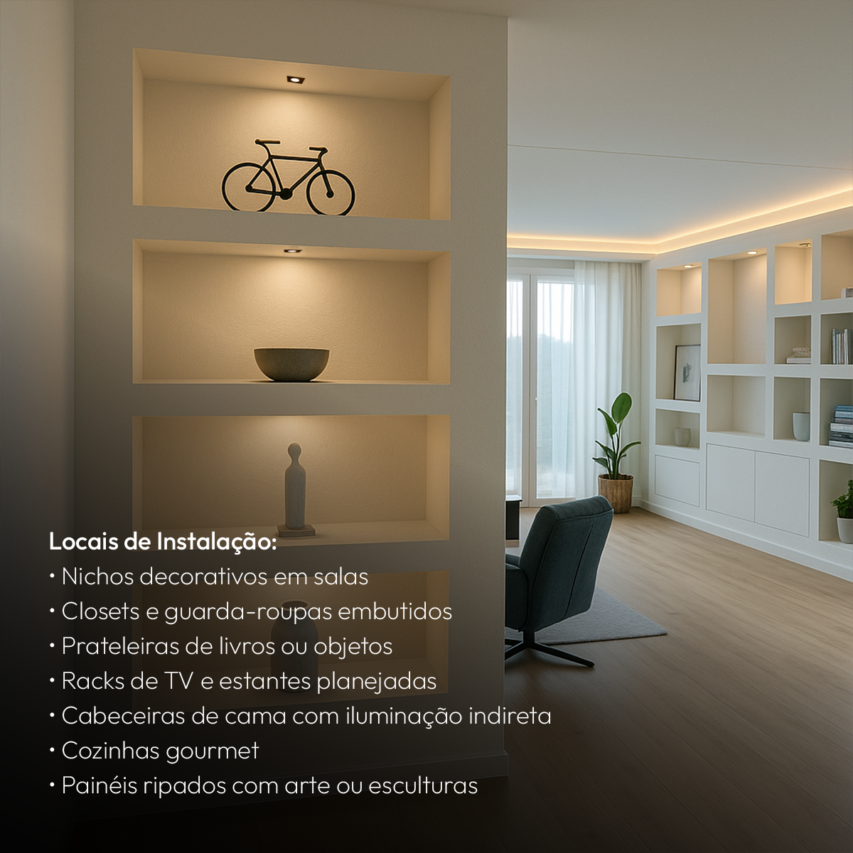 | O Mini Spot Móveis é a solução perfeita para iluminação de destaque em mobiliários, como guarda-roupas, racks, nichos decorativos e prateleiras. Seu design discreto e foco direcionado realçam detalhes e objetos, agregando valor estético aos móveis e ambientes internos.